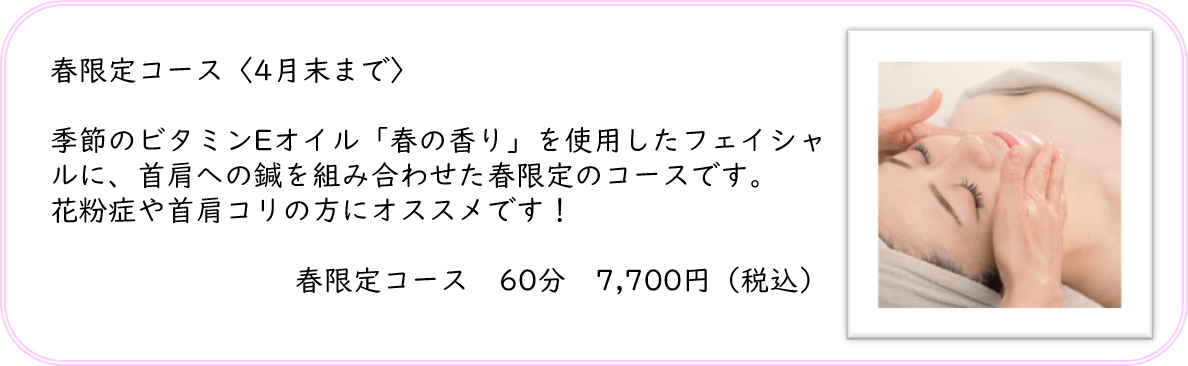 このコースでは、季節のビタミンEオイル「春の香り」を使用したフェイシャルに、首肩への鍼を組み合わせています。